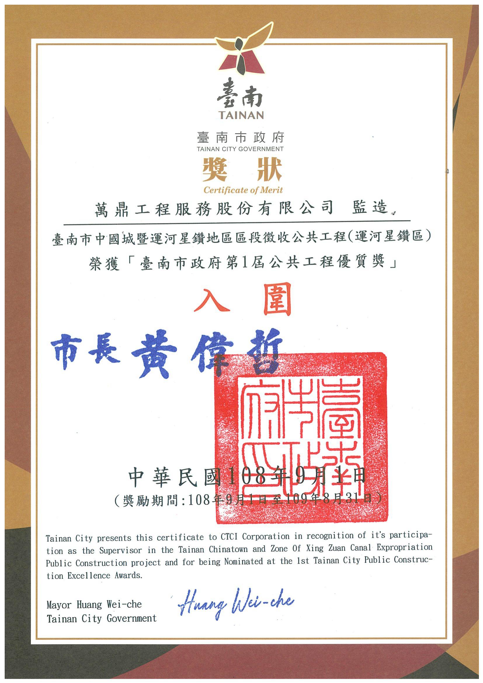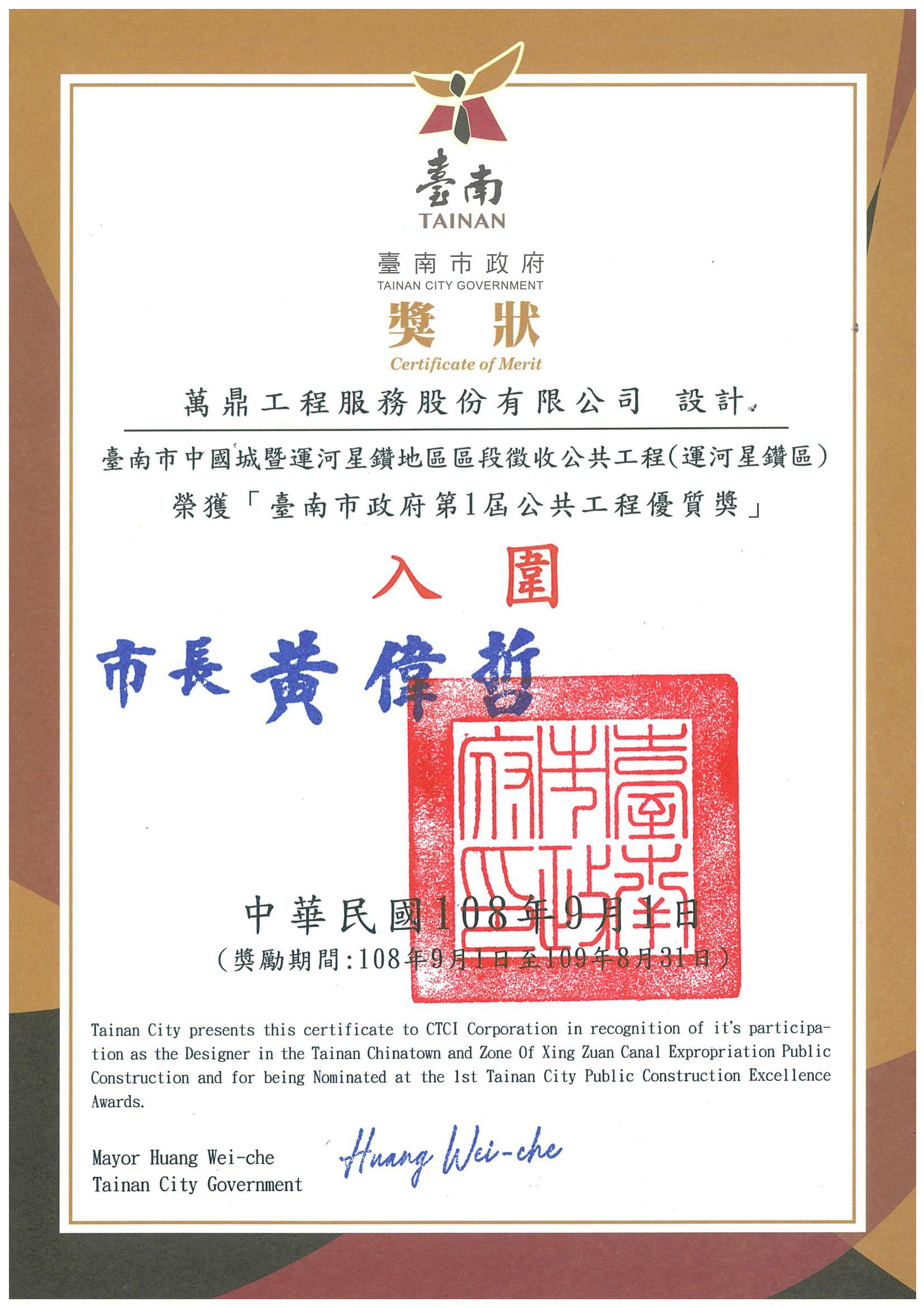 - 2019/09/01萬鼎「台南市中國城暨運河星鑽地區區段徵收公共工程(運河星鑽區)」,入圍「台南市政府第一屆公共工程優質獎」設計及監造單位2項獎項頒獎單位:台南市政府