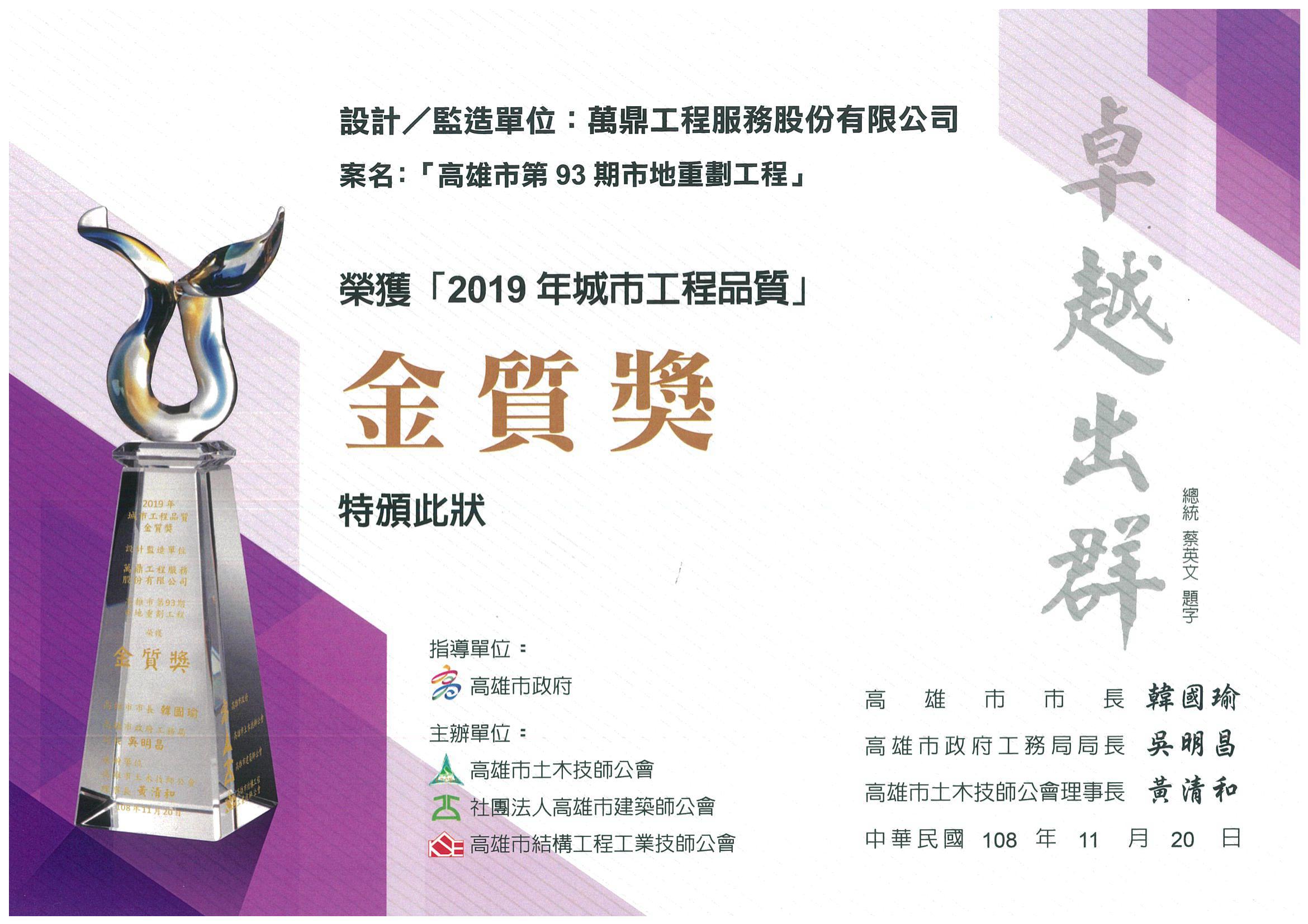 - 2019/11/20萬鼎「高雄市第93期市地重劃工程委託規畫設計及監造技術服務工作」,榮獲「城市工程品質金質獎」頒獎單位:高雄市政府