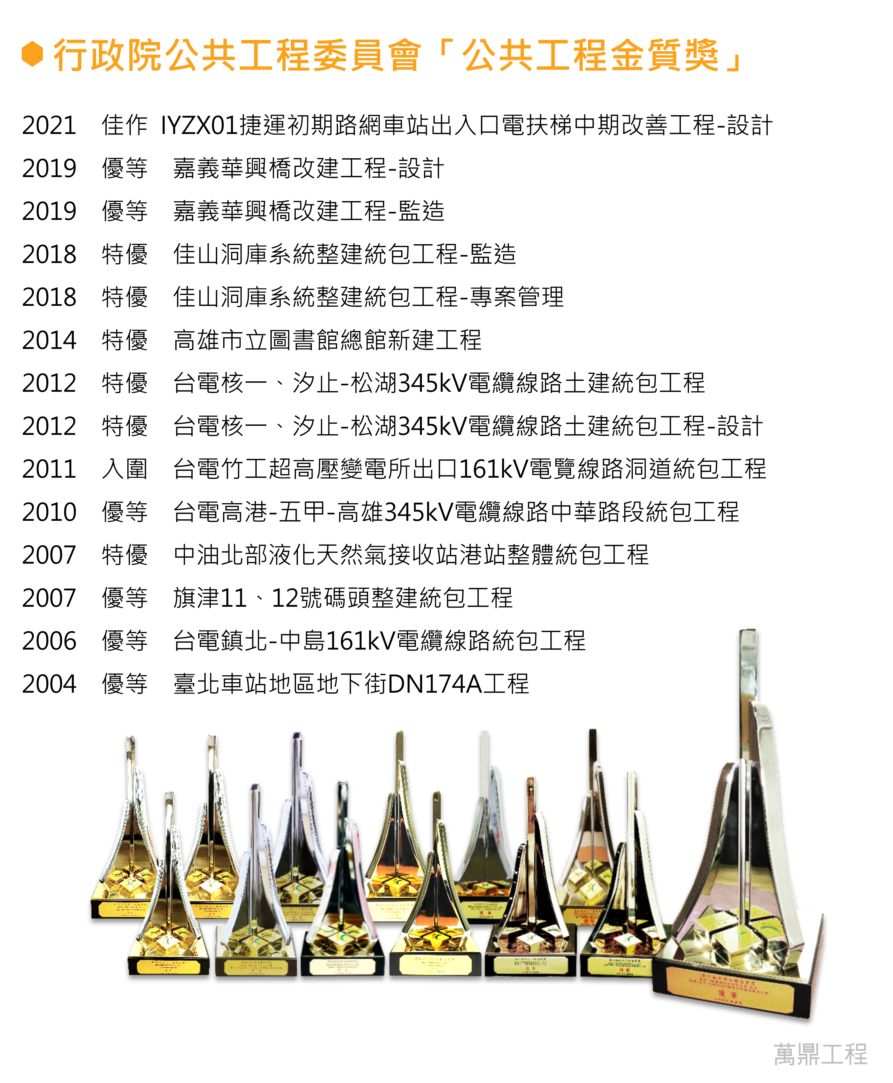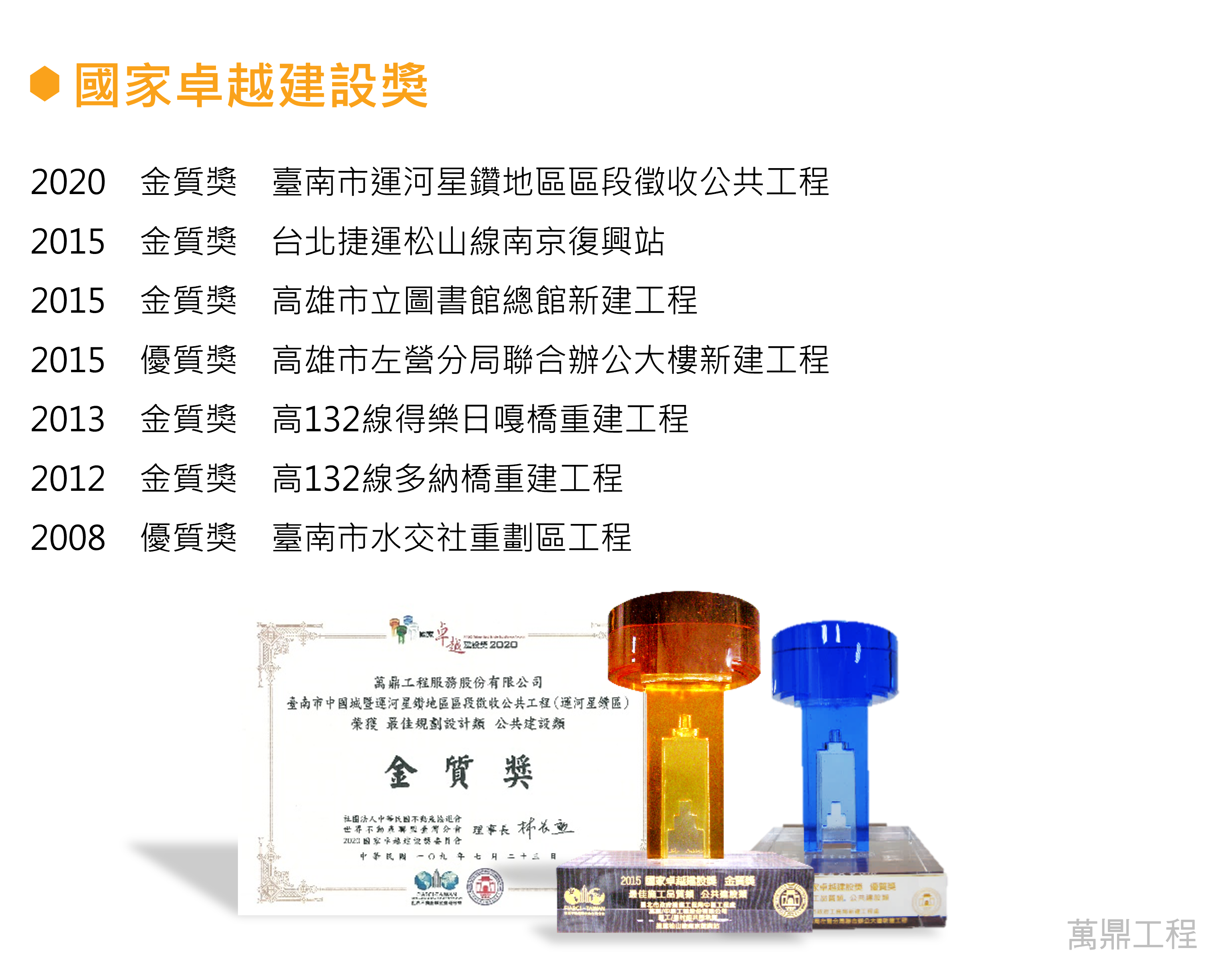 萬鼎工程致力成為「最直得信賴的工程服務團隊」,秉持追求卓越的企業精神,深受各界肯定,履獲國內外獎項。