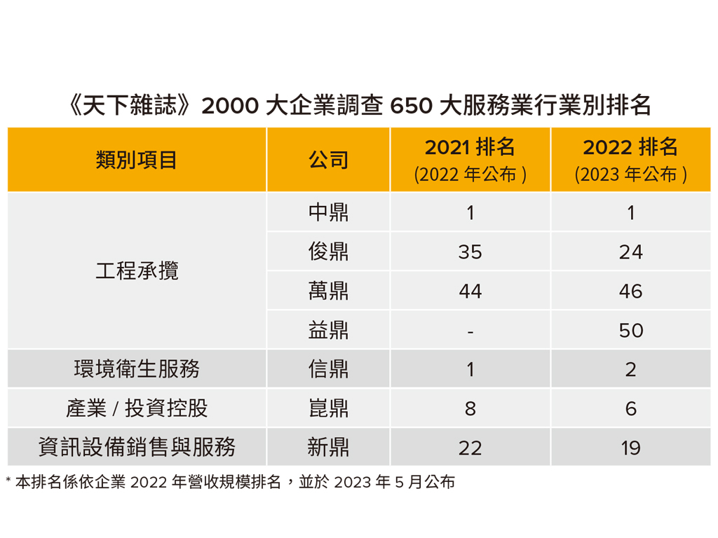 - 2023/06/13天下雜誌2000大企業調查出爐,中鼎集團蟬聯工程承攬類榜首,集團多家公司入榜,其中萬鼎名列工程承攬類第46名。天下雜誌2023年5月份公布的2000大企業調查,中鼎集團成員包含中鼎、崑鼎、信鼎、俊鼎、新鼎、萬鼎及益鼎七家公司,皆入榜650大服務業之列。![]() ![]()