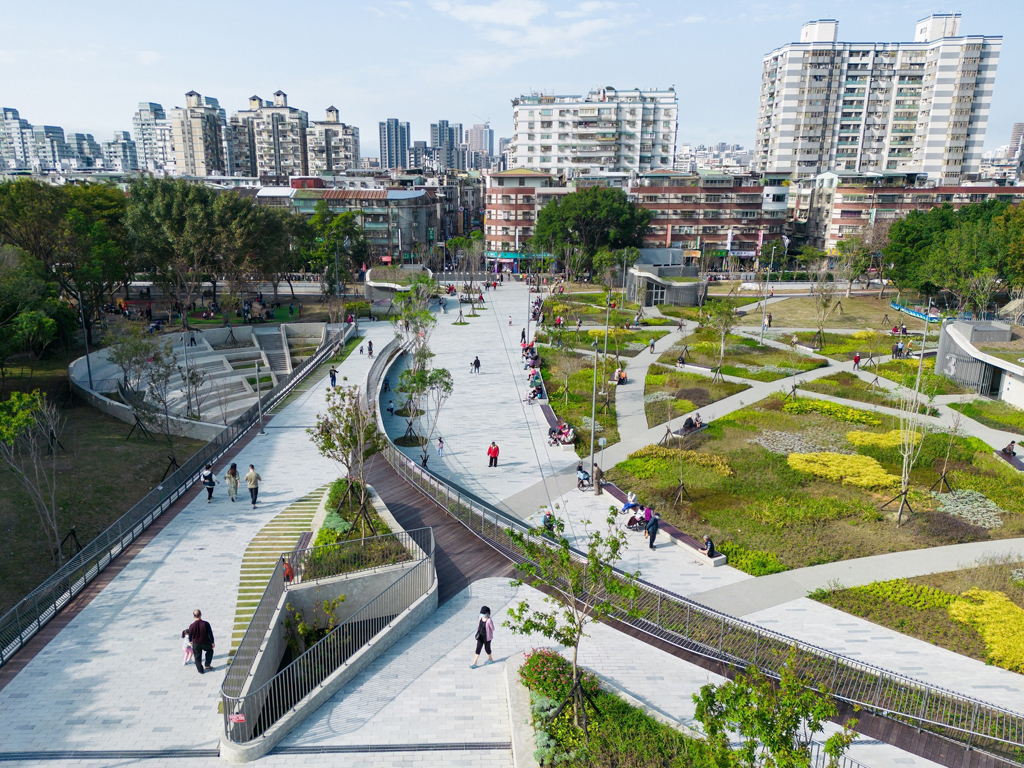 萬鼎在本案採取的智能及綠色技術包括:從規劃設計開始,即重塑地面層公園中軸廣場與設置景觀空橋,克服原公園中軸帶地形4.5m高差,減少回填土方量,延續公園既有功能;此外,更打造下沉式廣場,將地下停車場出入口導向地面層既有遊戲場等設施,強化公園連結性,並導入空氣及自然光,創造友善健康的停車空間,亦可疏散分流大型賽事的人群。此外,更以BIM建築資訊模型(Building Information Modeling)進行設計與建築、結構、機電施工界面整合,解決施工衝突點與優化工項順序,以提升工程品質。而本案在工程進行期間,受到COVID 19疫情、缺工缺料、9個颱風等衝擊,萬鼎仍克服困難,如期如質完工,並累積約30萬安全工時。![]() ![]() ![]()