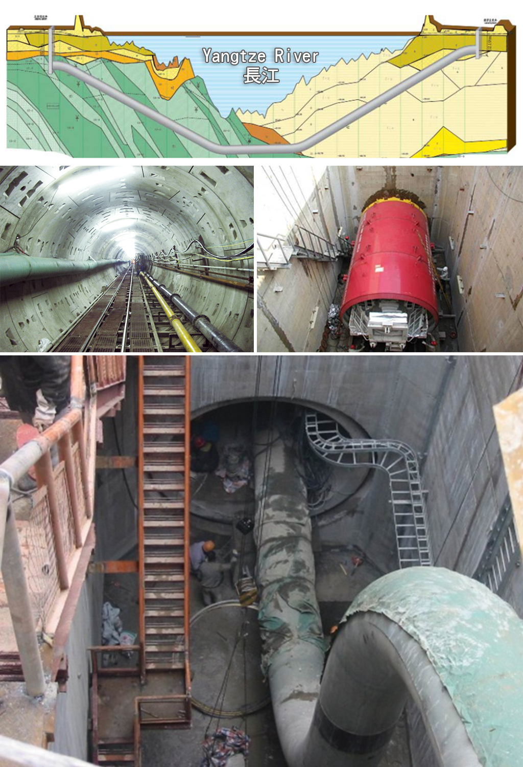 - The San-Jiang-Kou tunneling work beneath the Yangtze River for the West to East Gas Transmission ProjectThe 4,000 km long West to East Gas Transmission pipeline meanders from Lunnan in Xinjiang Uyghur to Shanghai. It passes through eight provinces while get across the Yangtze and Yellow River several times. Though the Directional Drilling and Pipe - Jacking methods are employed in most sect ions of the Project, the Shield Tunnel ing Me thod i s adopt ed when pa s s ing through the Yangtze River at San-Jiang-Kou, Nanjing for its crossing span, strong current, huge volume of earth covering, and variety of geological structures including alluvial gravel and rock layers. The San- Jiang-Kou tunneling work beneath the Yangtze River (SJK tunneling work) was identified as the Critical work in the West–East Gas Pipeline Project.![]()
