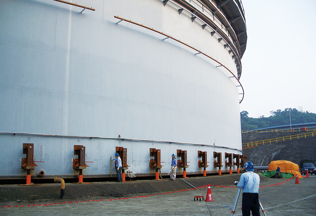 In this case, a 100,000 kiloliter oil tank (88.4m in diameter and 20.7m in height) suffered differential subsidence at the bottom, which caused wall plate deformation, and floating roof jam . This lead to a decrease in oil storage level to a height less than 9 meters; lower than 60% of the designed amount. CTCI REI utilized our patent -“Floating Roof Oil Tank Subsidence Repair Method” to repair the deformed oil tank by using Computer Control Synchronous Jacking System (CCSJS). The repaired tank recovered the oil storage height from 9m to 16m, and the tank storage returned to its operation level.